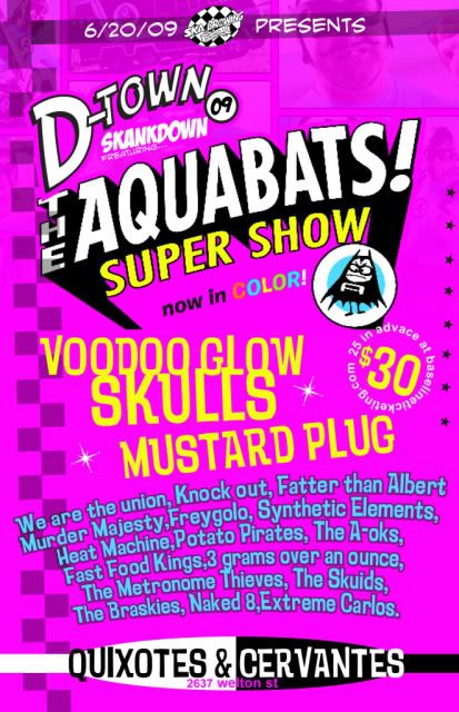 This concert was absolutely amazing :) I was so happy to be able to go to this because I only found out about it a few weeks ago and a lot of stuff had to fall into place in order for it to work. Special thanks to Ryan for switching days off, Mike for letting me borrow his car, and Dustin for letting me stay out past curfew. To my surprise this show was not only a concert, it was a ska festival with about 20 bands. I got to the venue in Denver at about 10:30 am and stayed until about 11:20 pm. It was a crazy day and night but everything was worth it once the Bats came out on stage. I was happy to be in the first row and get to talk to all of them, and it was great getting some pictures with Crash, Bones, and Rickey Fitness too. You know, by the way, the Aquabats are seriously the best band in the world.